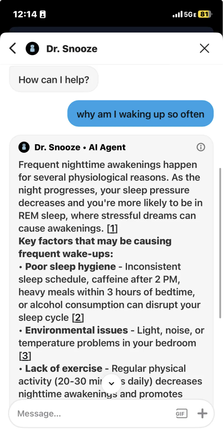 SleepSpace also features Dr. Snooze AI, the first AI assistant dedicated to sleep. It delivers instant answers, personalized coaching, and integrates with user data for precision insights. Human experts review interactions when needed to ensure accuracy.
