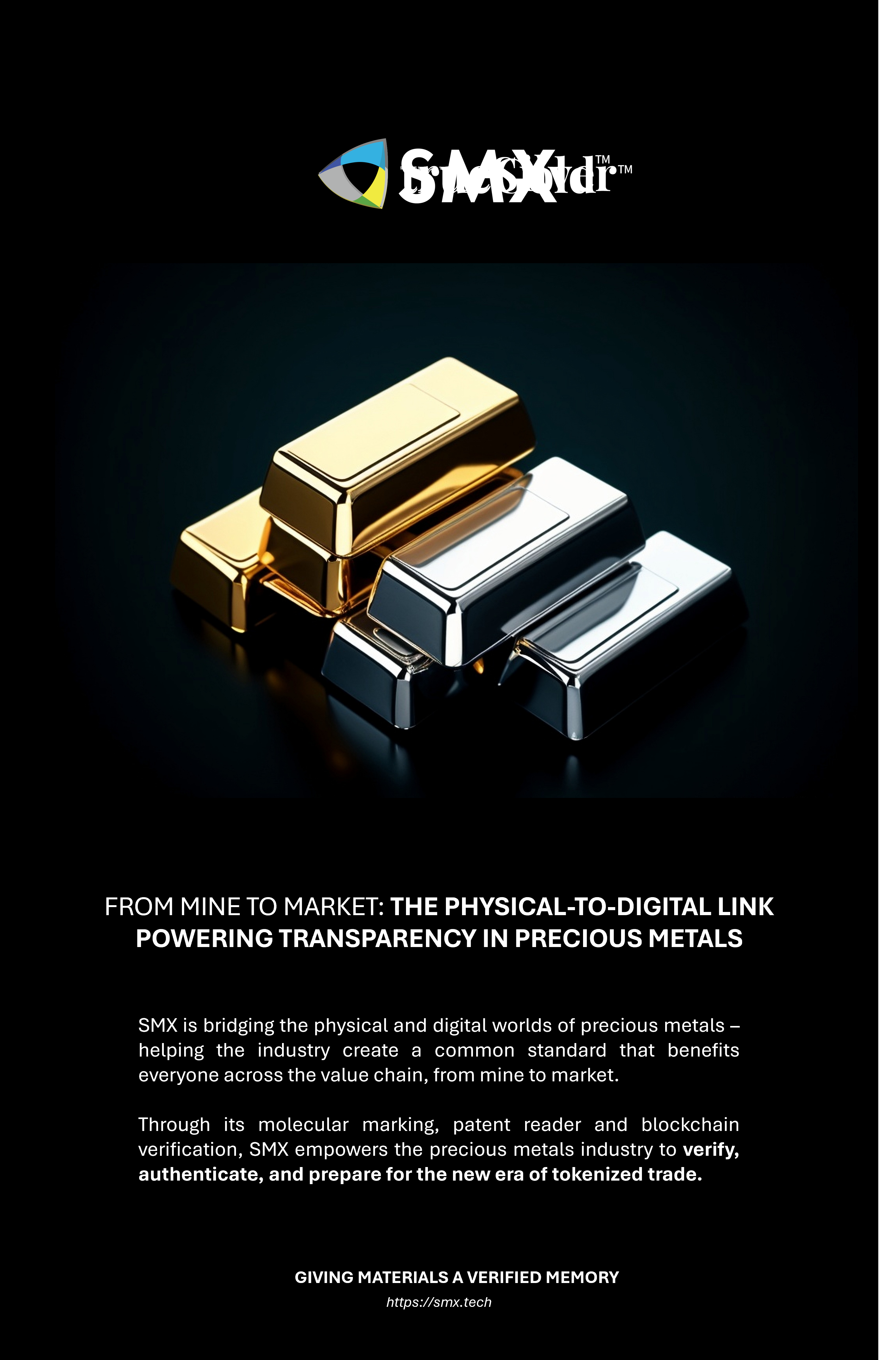 SMX's patented molecular technology enables a new level of transparency and authenticity across the gold and silver supply chain - from mine to refinery, vault to trade, and recycling to reuse. Each piece of metal is embedded with a unique molecular marker, creating an unalterable identity that is recorded on a tamper-proof blockchain, linking the physical asset to its digital twin.