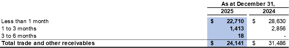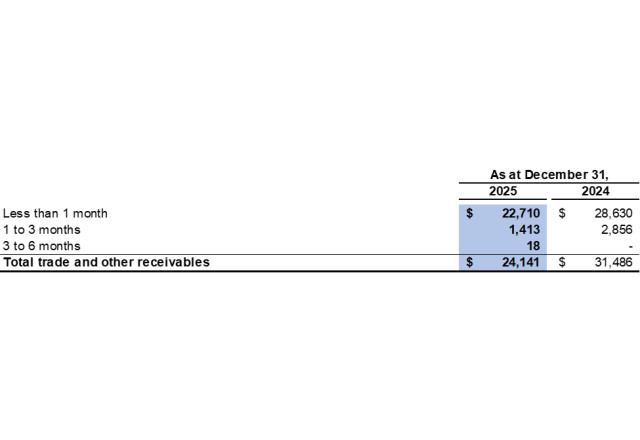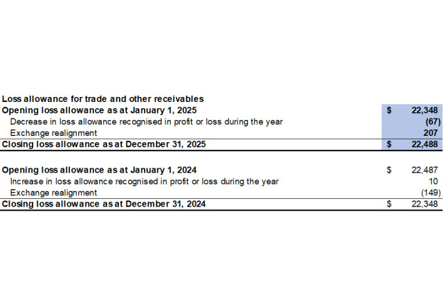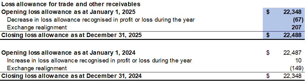The Company has determined that the loss allowance on its trade and other receivables was $22,488 as at December 31, 2025 (December 31, 2024: $22,348), based upon an expected loss rate of 10% for trade and other receivables 90 days past due and 100% for trade and other receivables 180 days past due.