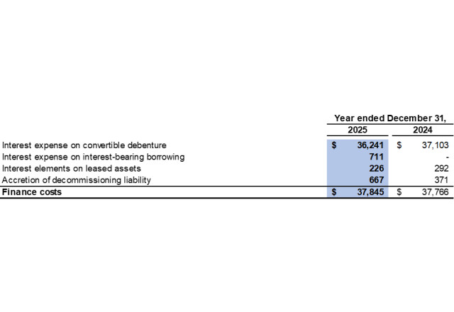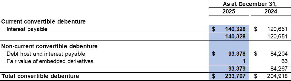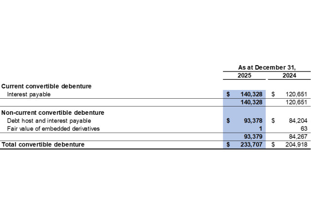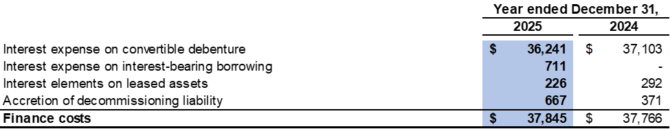 For the year ended December 31, 2025, the Company recorded interest expense of $36,241 related to the convertible debenture as a finance cost (2024: $37,103). The interest expense consists of the interest at the contract rate and the accretion of the debt host component of the convertible debenture. To calculate the accretion expense, the Company uses the contract life of 30 years and an effective interest rate of 14.1%.