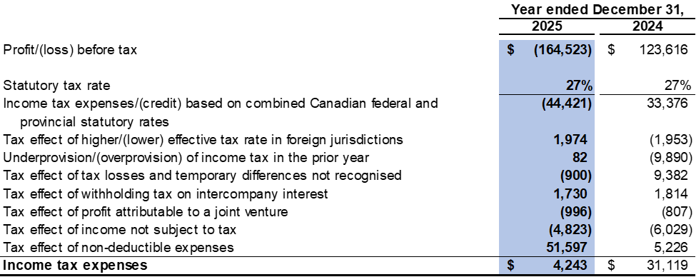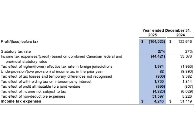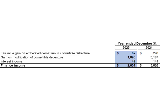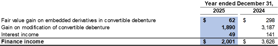 Finance costs were $37.8 million in both 2025 and 2024, which primarily consisted of interest expense on the $250.0 million Convertible Debenture.