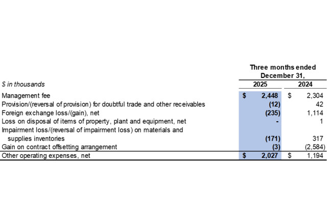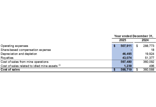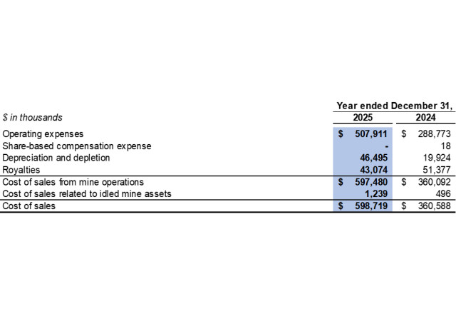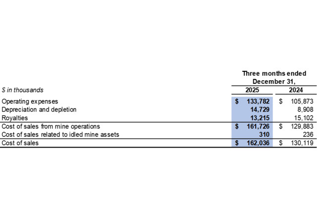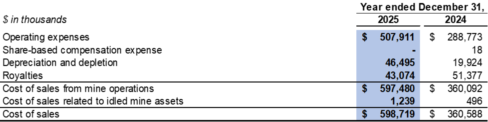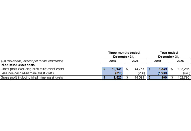 Cost of sales related to idled mine assets in the fourth quarter of 2025 included $0.3 million related to depreciation expenses for idled equipment (fourth quarter of 2024: $0.2 million).