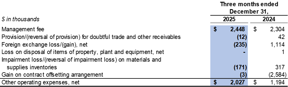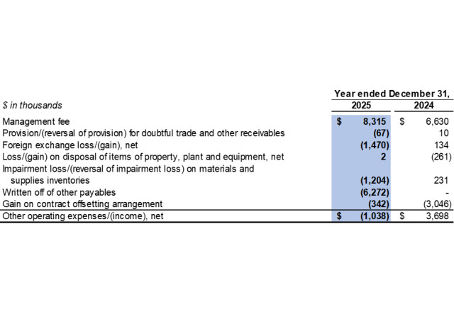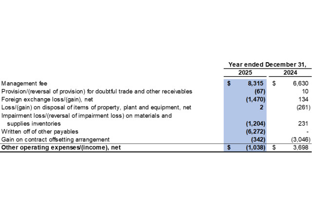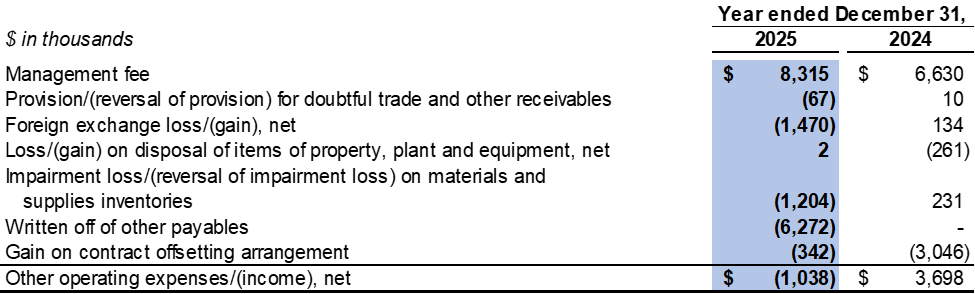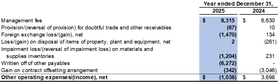 Other operating income was $1.0 million in 2025 as compared to other operating expenses of $3.7 million in 2024. The amount mainly consisted of foreign exchange gain of $1.5 million, reversal of impairment loss on materials and supplies inventories of $1.2 million and written off of other payables of $6.3 million, which was offset by management fee of $8.3 million.