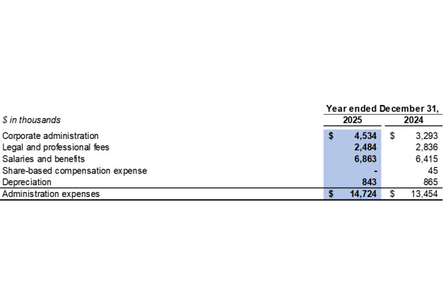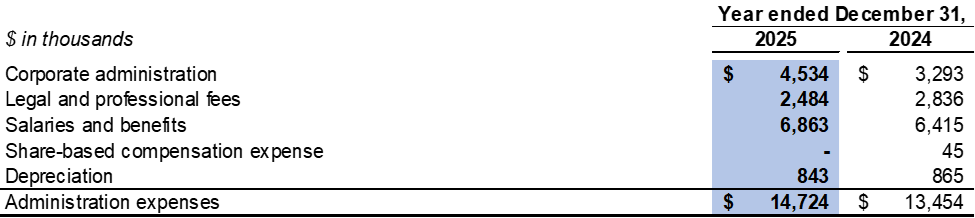 Administration expenses were $14.7 million in 2025 as compared to $13.5 million in 2024. The change was mainly due to higher daily administration fees and increased salaries and benefits as a result of an expansion of operations.