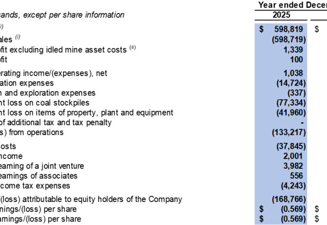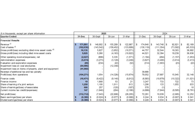 The Company recorded a $104.3 million loss from operations in the fourth quarter of 2025 compared to a $79.1 million profit from operations in the fourth quarter of 2024. The decrease was mainly due to the decreased average realised selling price realised in the fourth quarter of 2025 as compared to the same period in 2024, change in product mix, as the Company sold more processed coal with higher production costs and impairment losses on coal stockpile and items of property, plant and equipment of $65.0 million and $42.0 million were recorded respectively in the fourth quarter of 2025.