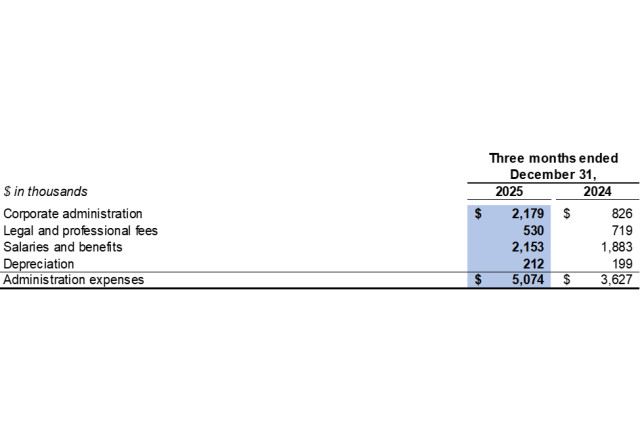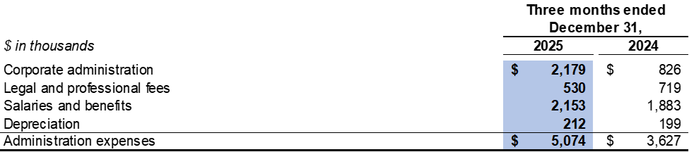 Administration expenses were $5.1 million in the fourth quarter of 2025 compared to $3.6 million in the fourth quarter of 2024. The change was mainly due to an increase in daily administration expenses and salaries and benefits as a result of an expansion of operations.