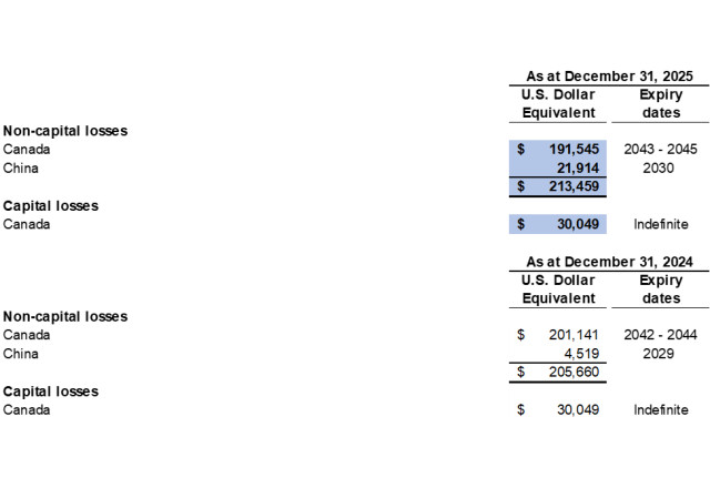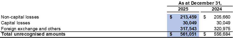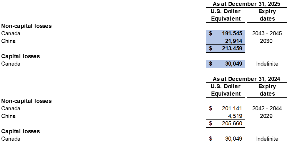 Potentially dilutive items not included in the calculation of diluted loss per share for the year ended December 31, 2025 include the underlying shares comprised in the convertible debenture and stock options that were anti-dilutive.