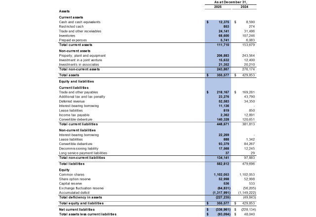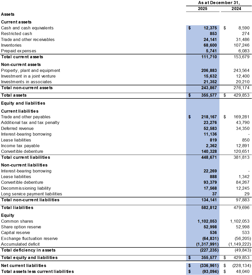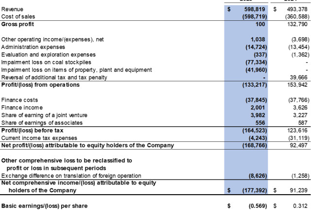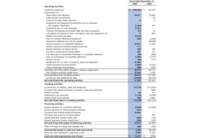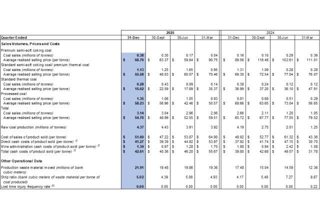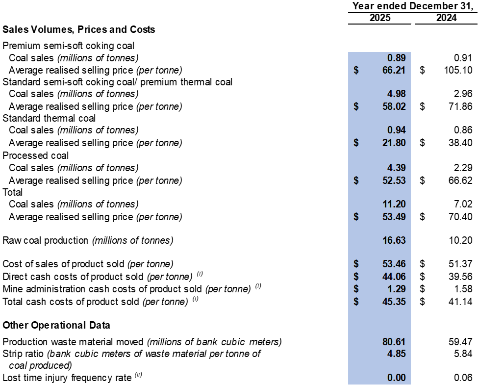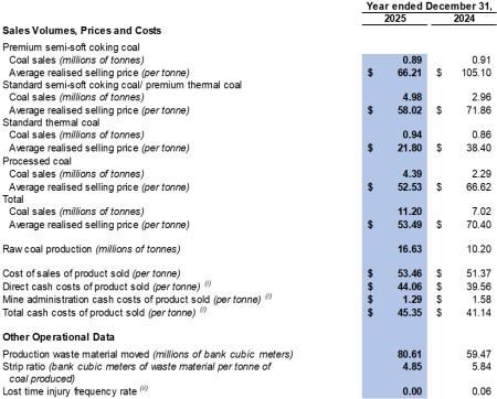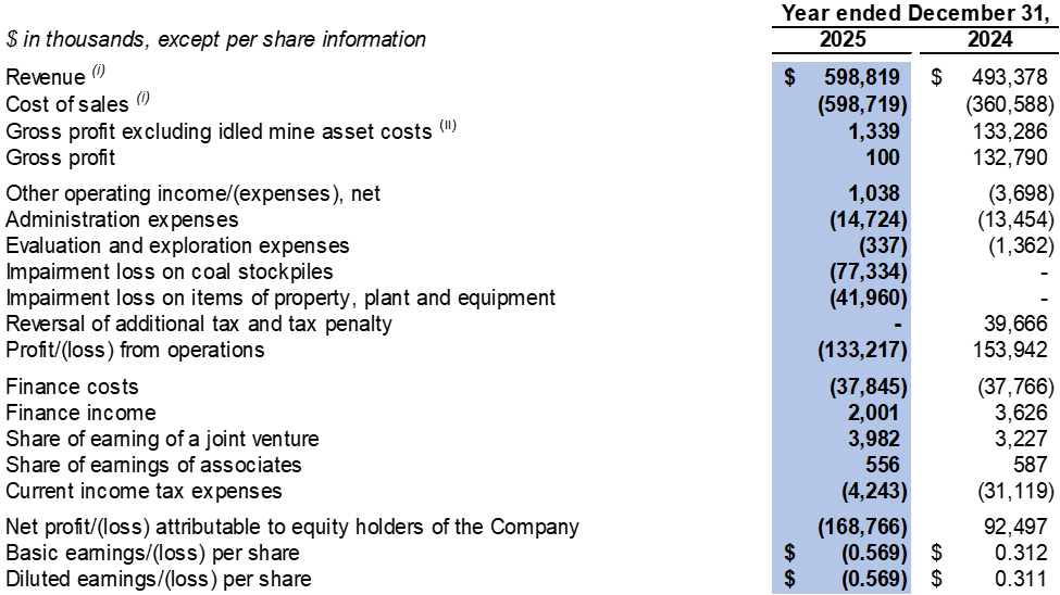 Financial Results - The Company recorded a $133.2 million loss from operations in 2025 compared to a $153.9 million profit from operations in 2024. The financial results were impacted by the decreased average realised selling price in 2025 as compared to 2024, the change in product mix year-over-year (as the Company sold more processed coal with higher production costs) and impairment losses on coal stockpile and items of property, plant and equipment of $77.3 million and $42.0 million were recorded respectively in 2025.