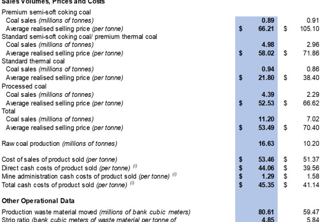 The Company recorded an average realised selling price of $53.5 per tonne in 2025 compared to $70.4 per tonne in 2024. The decrease was mainly due to the Company facing headwinds in the China coal market since 2024, leading to the Company changing its product mix to sell a greater percentage of lower-priced coal products. The product mix for 2025 consisted of approximately 8% of premium semi-soft coking coal, 45% of standard semi-soft coking coal/premium thermal coal, 8% of standard thermal coal and 39% of processed coal compared to approximately 13% of premium semi-soft coking coal, 42% of standard semi-soft coking coal/premium thermal coal, 12% of standard thermal coal and 33% of processed coal for 2024.