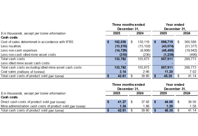 The Company's unit cost of sales of product sold was $53.5 per tonne in 2025 compared to $51.4 per tonne in 2024. The increase was due to the change in product mix year-over-year, as the Company sold more processed coal with higher production costs.