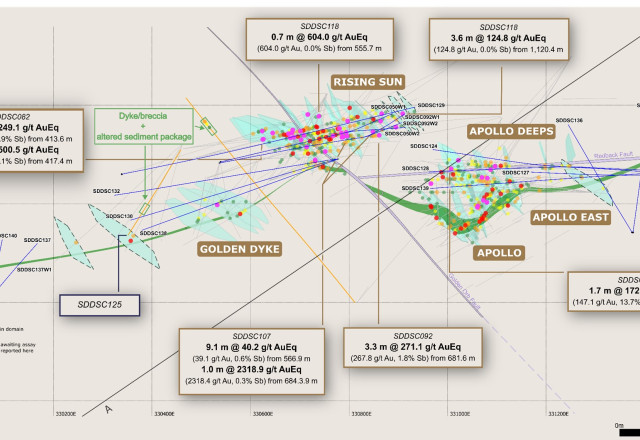 SDDSC125 intersected the dyke/breccia/altered sediment host structure down hole from 390 m to 415 m in a 190 m step out below historic workings, proving the mineralized host continues along strike and at depth. Highlights included 1.0 m @ 2.4 g/t AuEq (1.4 g/t Au, 0.5% Sb) from 414.7 m (Figures 1 and 2).