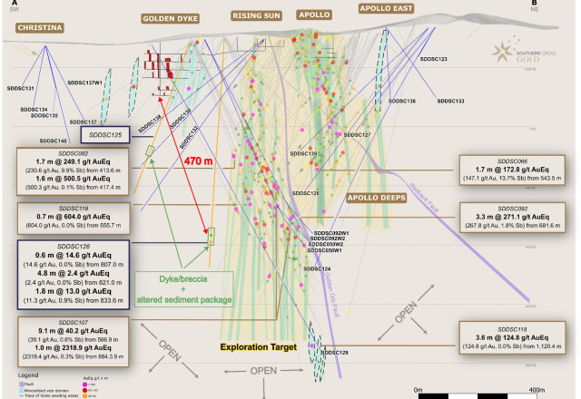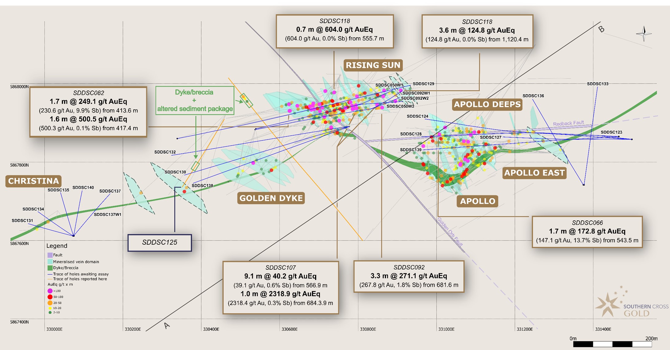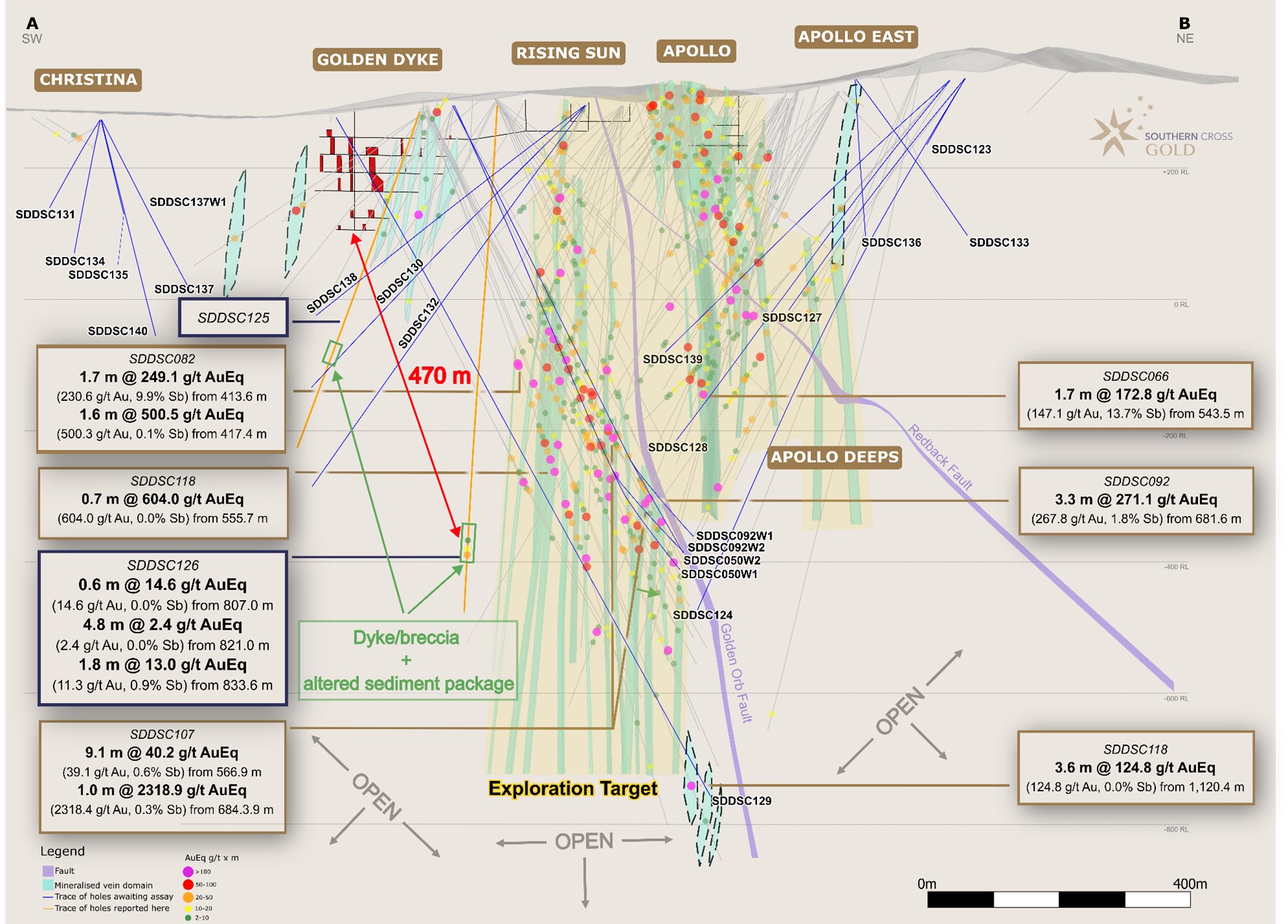Figure 2: Sunday Creek longitudinal section across A-B in the plane of the dyke breccia/altered sediment host looking towards the north (striking 236 degrees) showing mineralised veins sets. Showing from broadly north-south drilled control holes SDDSC125, 126 reported here (blue highlighted box, orange trace and green dyke breccia highlighted), with selected intersections and prior reported drill holes. For location refer to Figure 1.