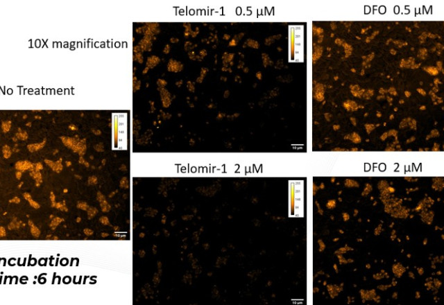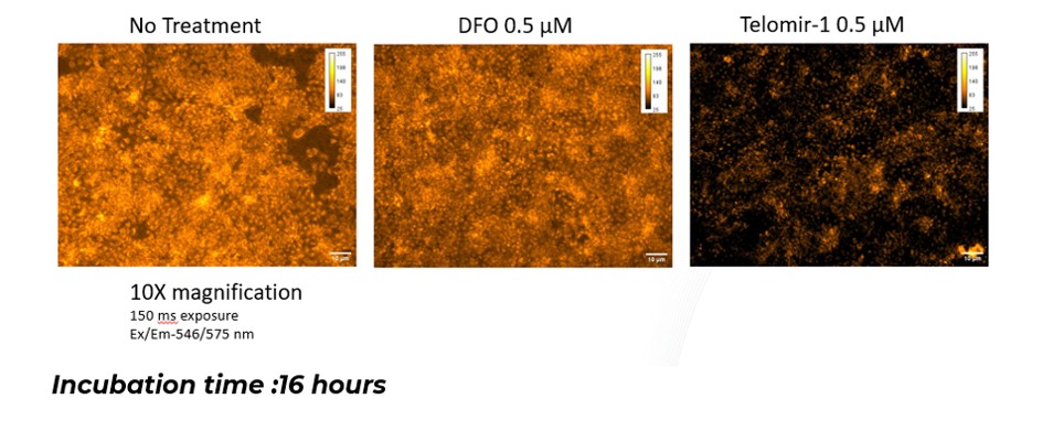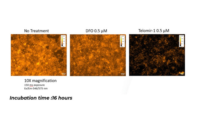 The study employed FerroOrange, a fluorescent probe that selectively detects ferrous iron (Fe²⁺) inside living cells. HaCaT cells were incubated with Telomir-1 or DFO for various time points. After three, six and sixteen hours, fluorescence microscopy revealed a markedly lower intracellular iron signal in Telomir-1-treated cells, indicating strong cell penetration and iron-modulating capacity relative to DFO at the same concentrations.