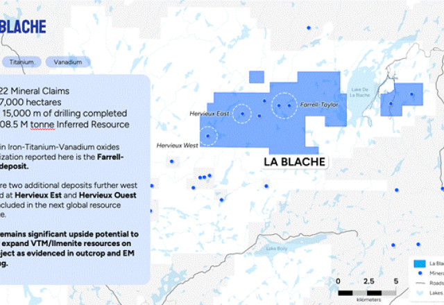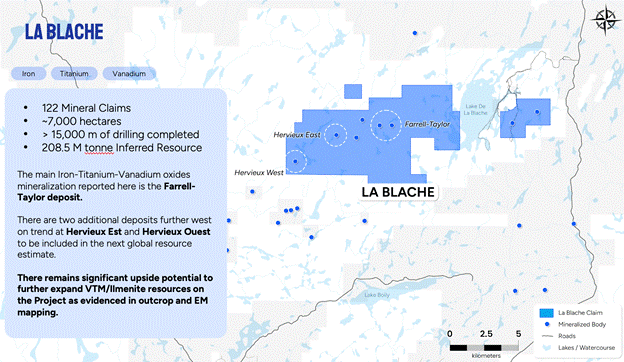 "La Blache is ideally located near existing infrastructure, a skilled regional workforce, and the deep-water Port of Saguenay. Beyond Titanium and Vanadium, we continue to identify promising signatures of Scandium and Gallium, offering additional upside. There is a push for onshoring critical metals and rare earth elements in North America, and adding Scandium and Gallium mineralization just adds to our world class massive oxide deposit as we work towards defining our global mineral resource estimate (MRE) at La Blache."