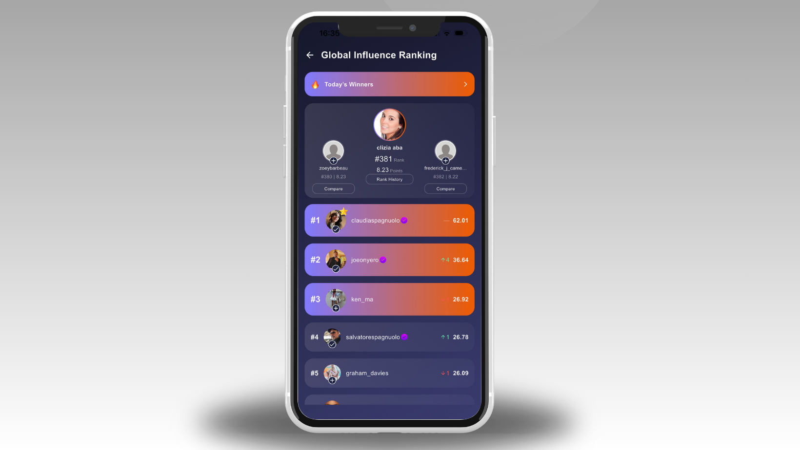 Every post, every interaction, every moment on the platform directly affects a user's global position. Rankings rise and fall continuously, turning influence into a live, visible, and competitive system.