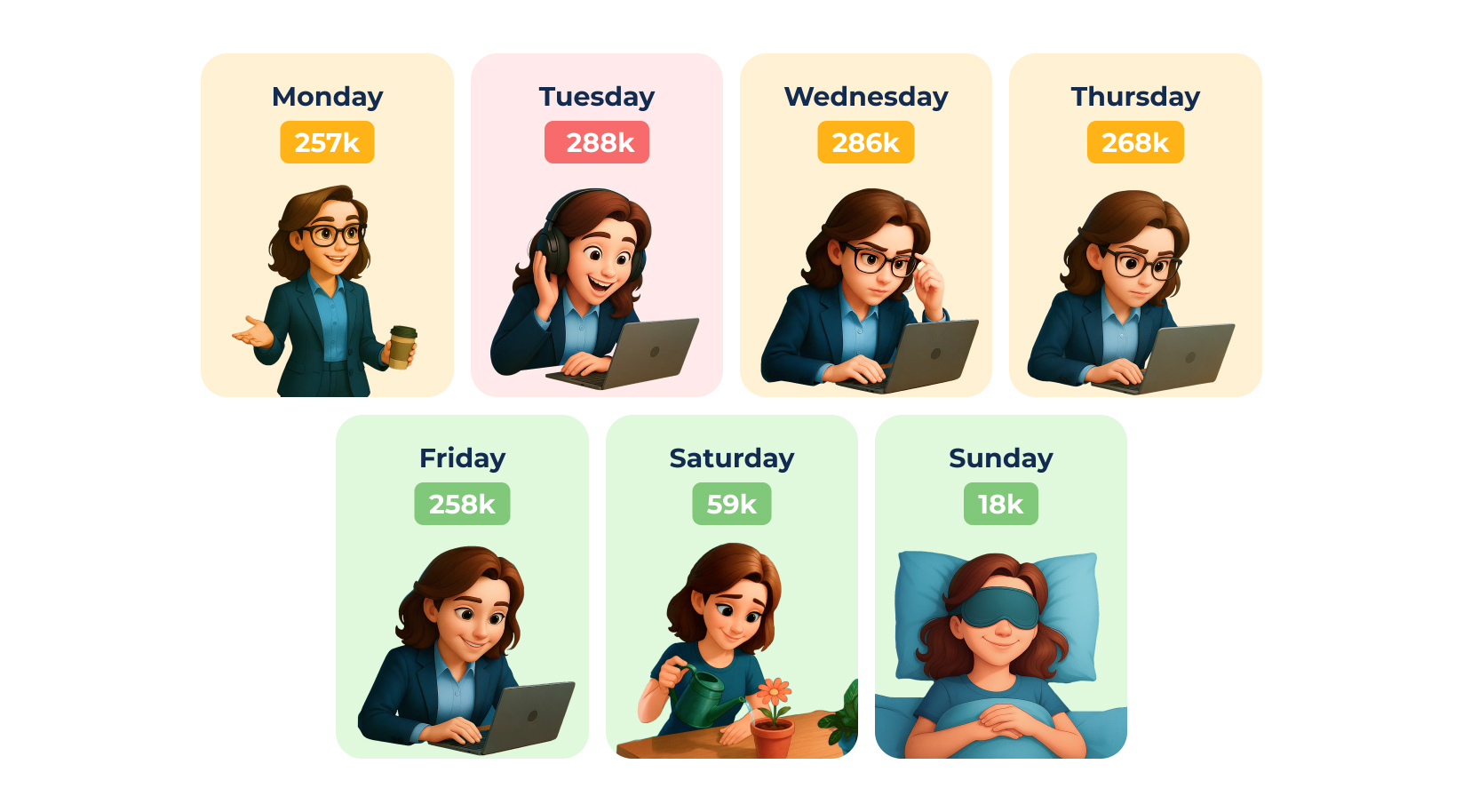 The sharp drop-off on Saturday (59,353) and Sunday (18,678) clearly shows the importance of work-life balance for our users.