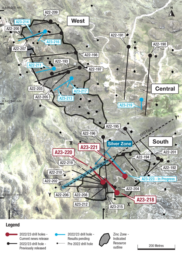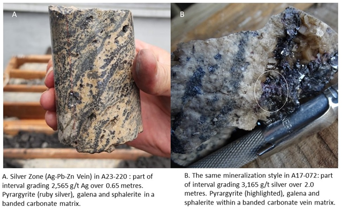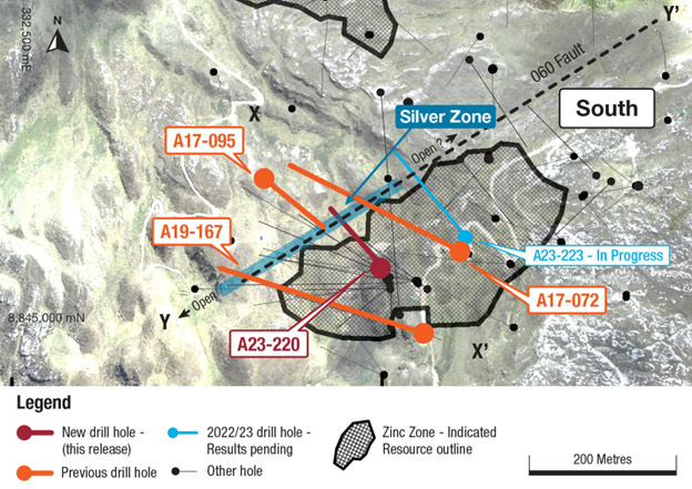 - Hole A23-220: 29.5 metres at 182 g/t Ag, 2.4% Zn & 0.8% Pb from 289.65 metres (including 7.1 m at 604 g/t Ag 2.7% Zn & 1.6% Pb from 310.9 metres (new drill hole);