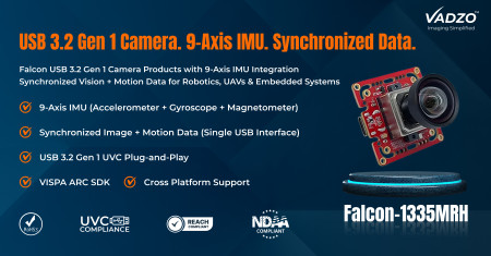 Vadzo Imaging's Falcon USB 3.2 Gen 1 camera portfolio is currently available for evaluation prototyping and production deployment. The Falcon-1335CRA, Falcon-830CRS, Falcon-821CRS, Falcon-2020MRS and Falcon-1335MRH are available now via Vadzo's online store with full technical documentation evaluation unit access and direct applications engineering support. The 9-axis IMU feature expansion for these products is now available. OEMs system integrators and robotics developers interested in early access custom IMU board configurations or volume production planning can contact Vadzo directly to align on timelines and requirements.