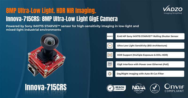 FORT WORTH, Texas, March 23, 2026 (Newswire.com) - Vadzo Imaging, a global provider of embedded vision cameras, today introduced the Innova-715CRS, an 8.46MP GigE camera built on the Sony STARVIS IMX715 CMOS sensor. Designed for vision systems operating in low-light, mixed-light, and IR-assisted environments, the camera addresses imaging challenges common in industrial automation, robotics, warehouse operations, and smart city deployments.
