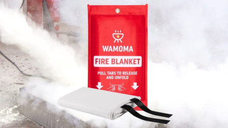 The Wamoma Fire Blanket is a fire suppression blanket designed to smother small household fires by cutting off the oxygen supply that fuels combustion. According to the company, the blanket is made from 100% woven fiberglass treated with flame-retardant silicone fabric and is rated to withstand temperatures up to 1076 degrees Fahrenheit (580 degrees Celsius).