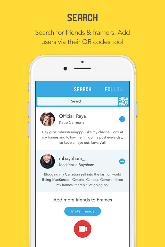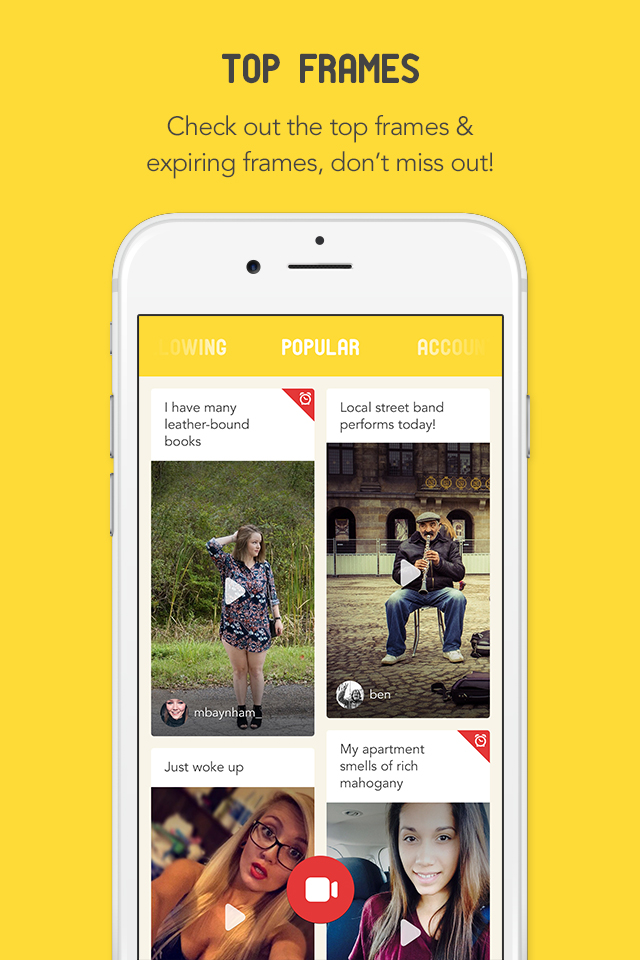 Frames provides a social network which makes creating, sharing and watching short video snippets super fun and easy. Whether you’re on the go or just chilling, being the life and soul of the party or trying something new, you can catch it wherever you want! These are snippets from your world so what better way to catch them than as you go about your daily life?