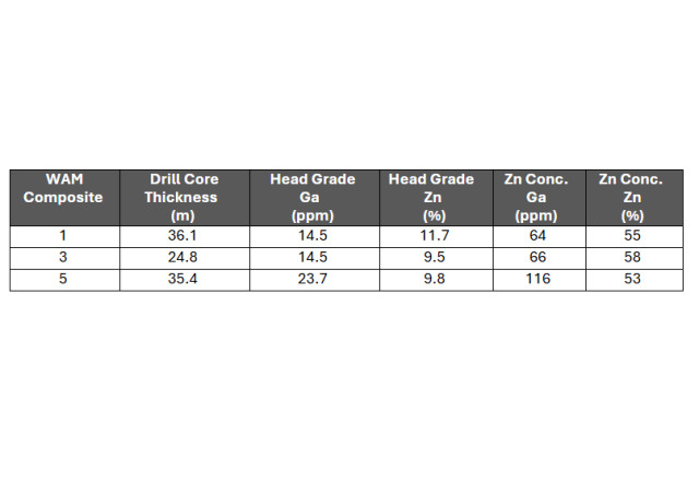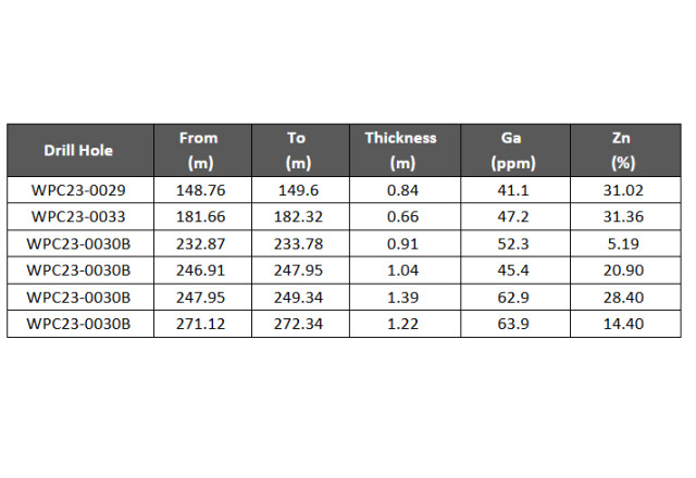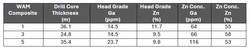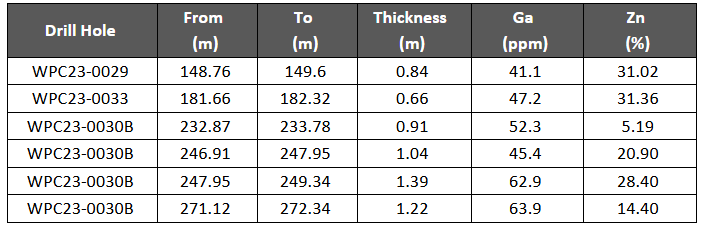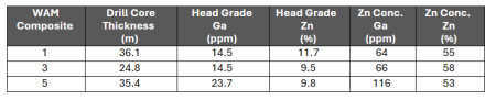 In addition to the zinc concentrate results in Table 1, WAM is re-analyzing select WPC drill core samples by ICP-MS methods for gallium. The first batch of results returned values ranging from 41.1 to 63.9 ppm gallium (Table 2). The second batch of results is expected in Q2 2025. These intercepts were not included in the representative composites reported in Table 1; however, these results in Table 2 highlights that zones of high-grade zinc and gallium exist within the WPC Inferred Resource.