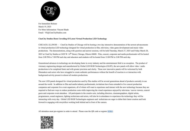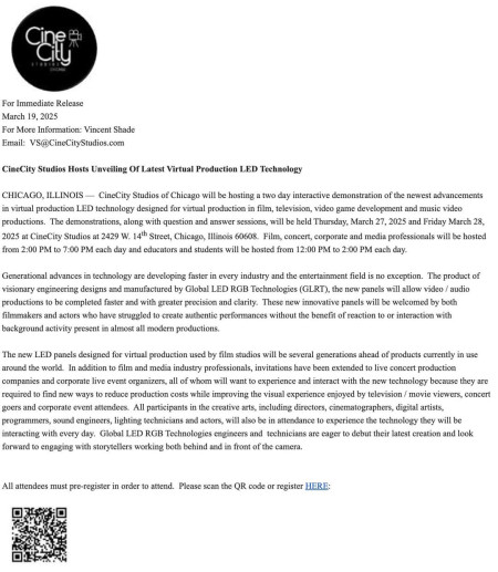 CHICAGO, March 25, 2025 (Newswire.com) - CineCity Studios of Chicago will be hosting a two-day interactive demonstration of the newest advancements in virtual production LED technology designed for virtual production in film, television, video game development and music video productions. The demonstrations, along with question-and-answer sessions, will be held Thursday, March 27, 2025 and Friday March 28, 2025 at CineCity Studios at 2429 W. 141h Street, Chicago, Illinois 60608. Film, concert, corporate and media professionals will be hosted from 2:00 PM to 7:00 PM each day and educators and students will be hosted from 12:00 PM to 2:00 PM each day.