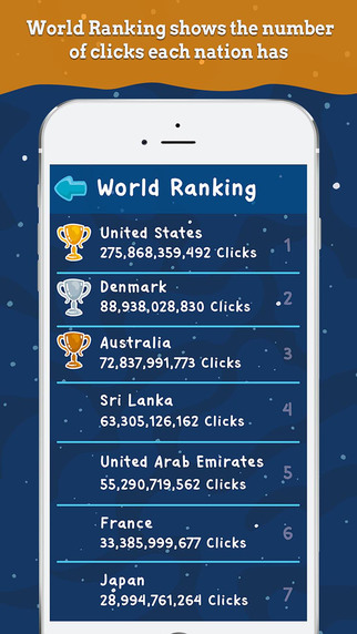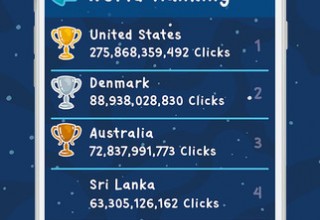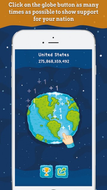 The best part of the app is its world ranking list, which displays the nations ordered according to the number of clicks received. Users can scroll up and down to find their nation among the world rankings. In order to bring it to the top, all that has to be done is a simple click on the globe button as many times as possible.