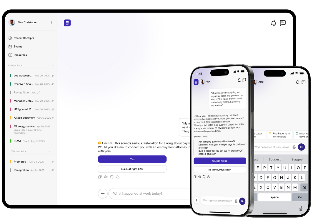 Premium users gain access to Jayla, an AI advocate that doesn't just listen, it acts. Simply describe what happened at work, and Jayla automatically creates documentation while flagging potential issues you might have missed. She'll draft that difficult email to HR, suggest next steps, and help you understand when it may be time to connect to a lawyer.