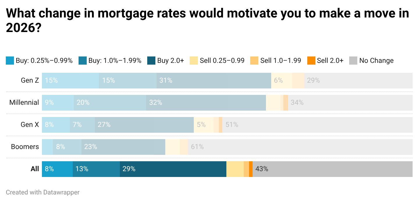 But most younger buyers say mortgage rates would need to drop by at least two points to motivate a home purchase; roughly one in three Gen Z (31%) and Millennial buyers (32%).